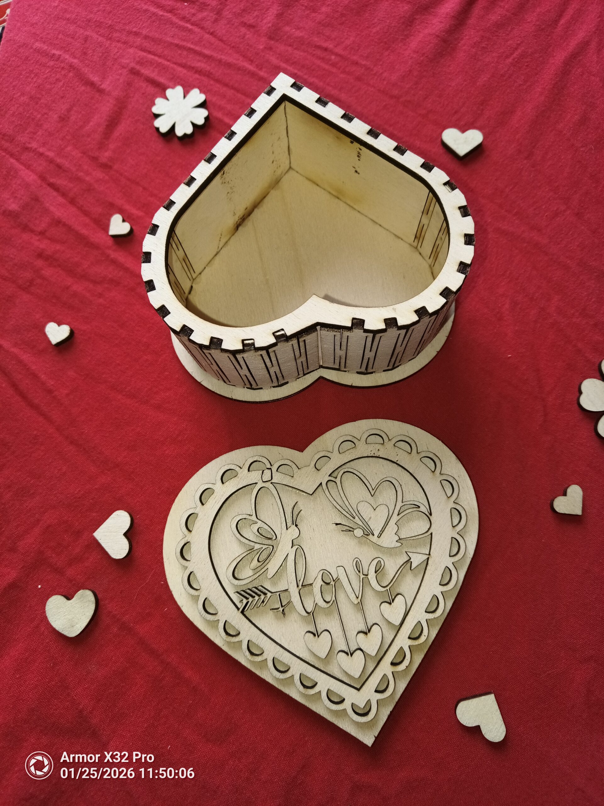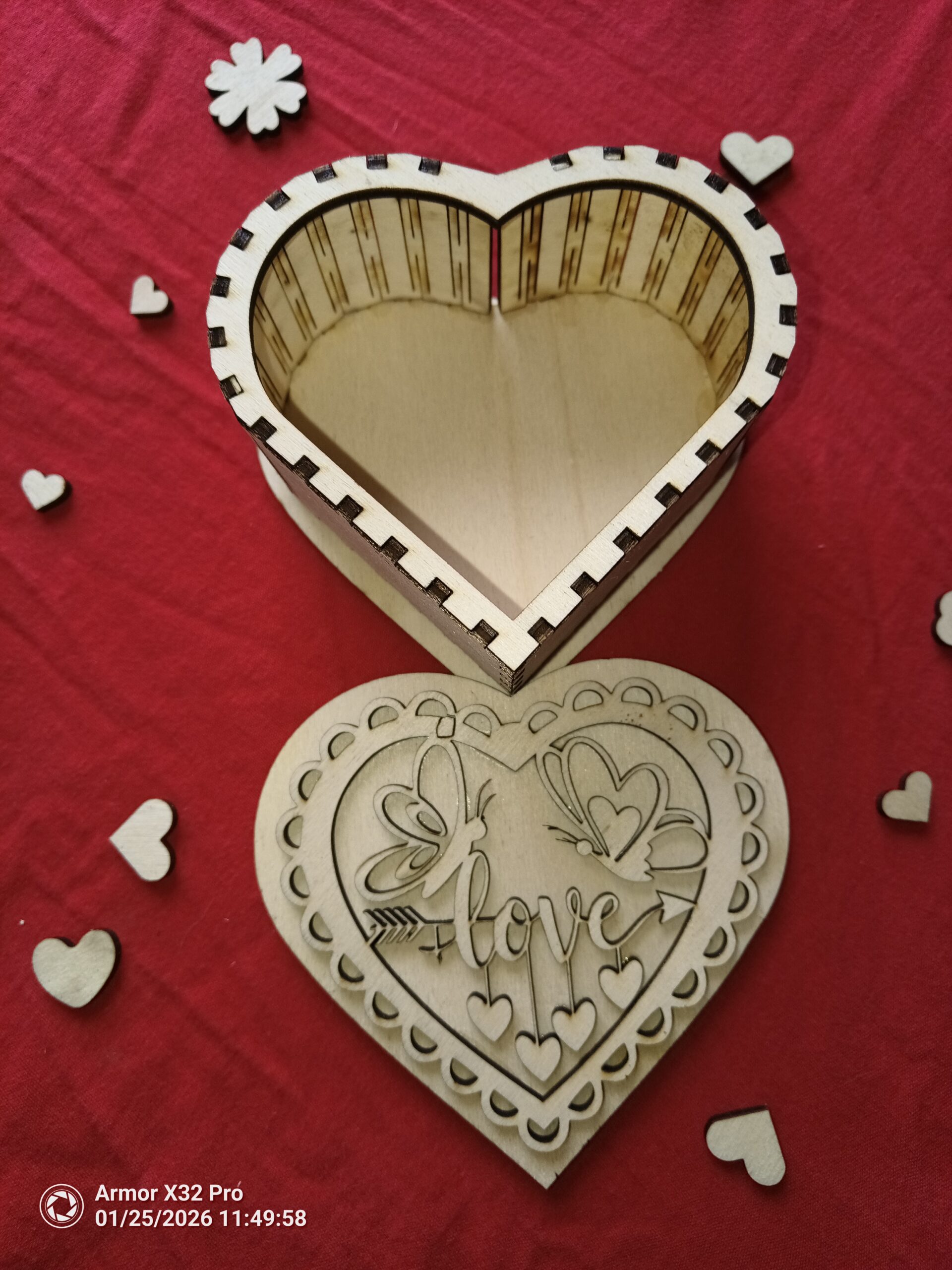 Boite en forme de cœur avec un couvercle amovible avec deux papillons se faisant face, au milieu de petits cœurs et du mot LOVE, pouvant contenir bijoux ou autres surprises pour la Saint Valentin.