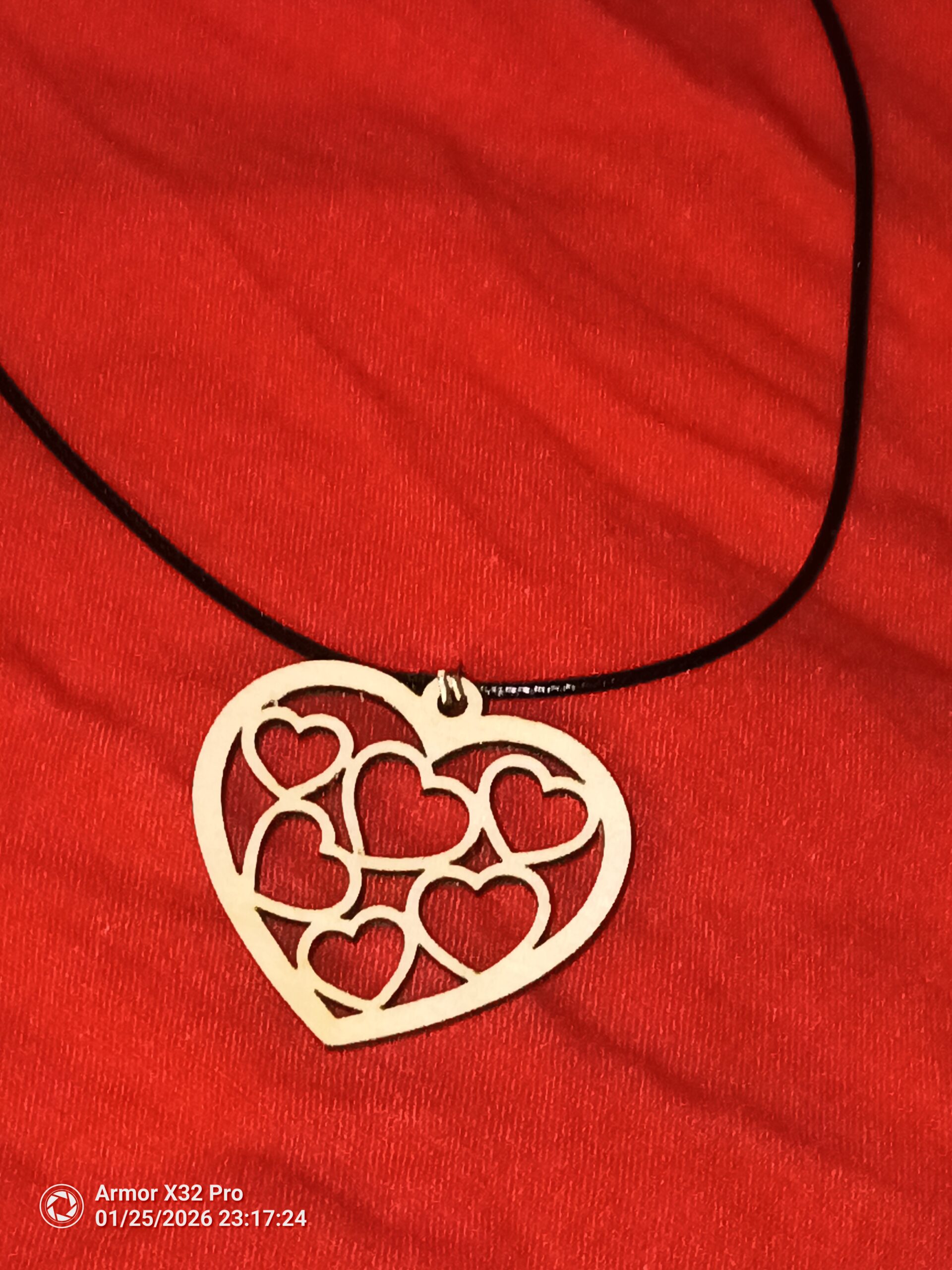 Pendentif en bois de peuplier en forme de cœur. L’intérieur est rempli de plusieurs petits cœurs découpés. Un cadeau idéal pour la Saint Valentin. Hauteur : 5cm, Largeur 5cm.